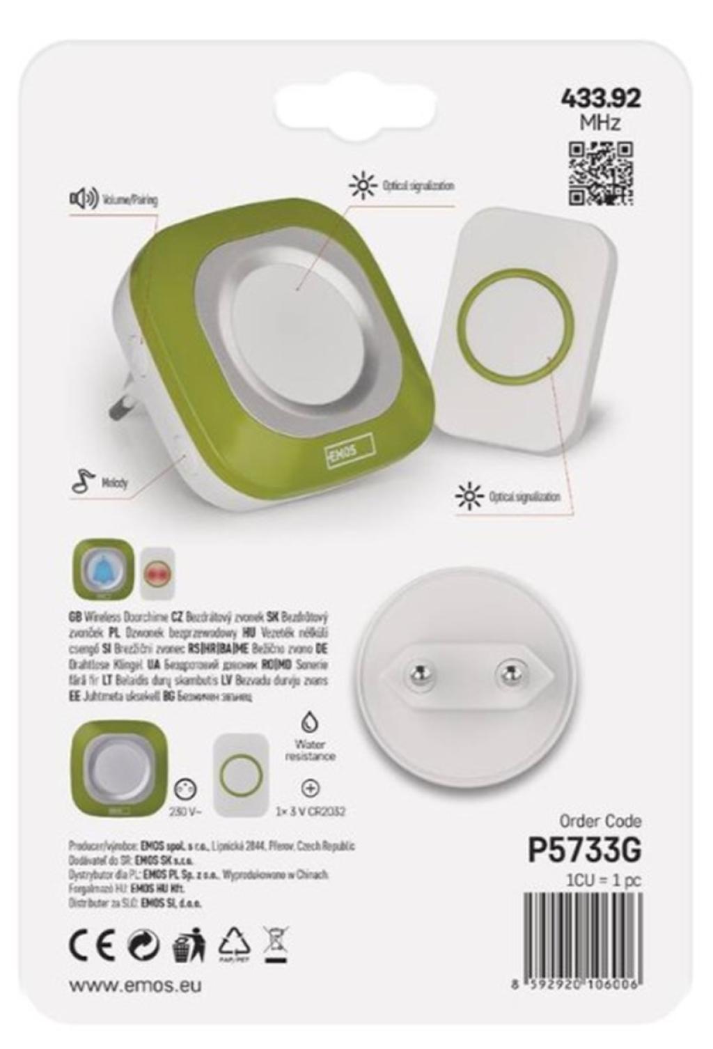 • vodeodolnosť • ochrana IP44 • napájanie tlačidla 3 V batériou CR2032 • napájanie hlavnej jednotky: zásuvka • optická signalizácia na tlačidle: áno • optická signalizácia na zvončeku: áno • maximálna hlasitosť zvonenia: 110 dB