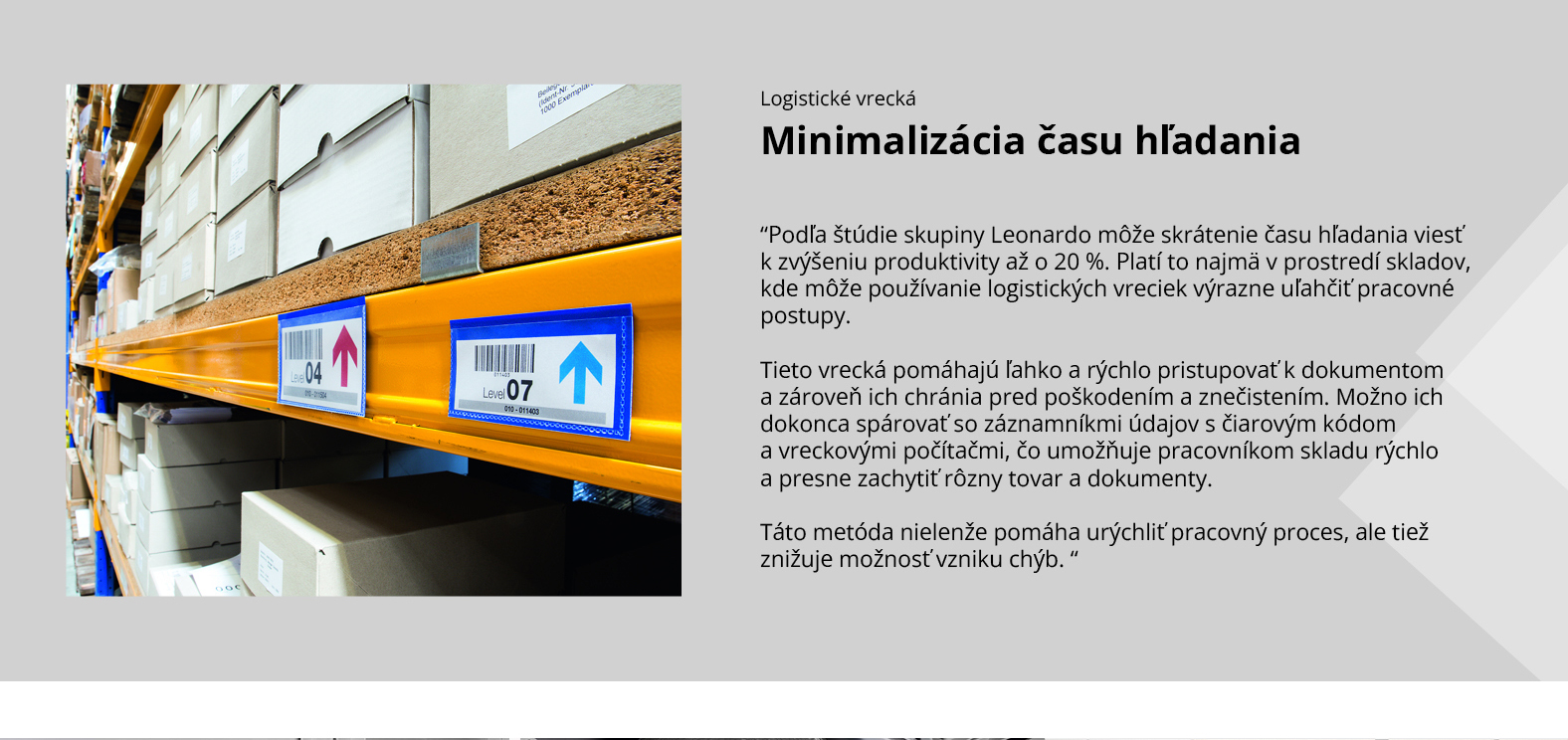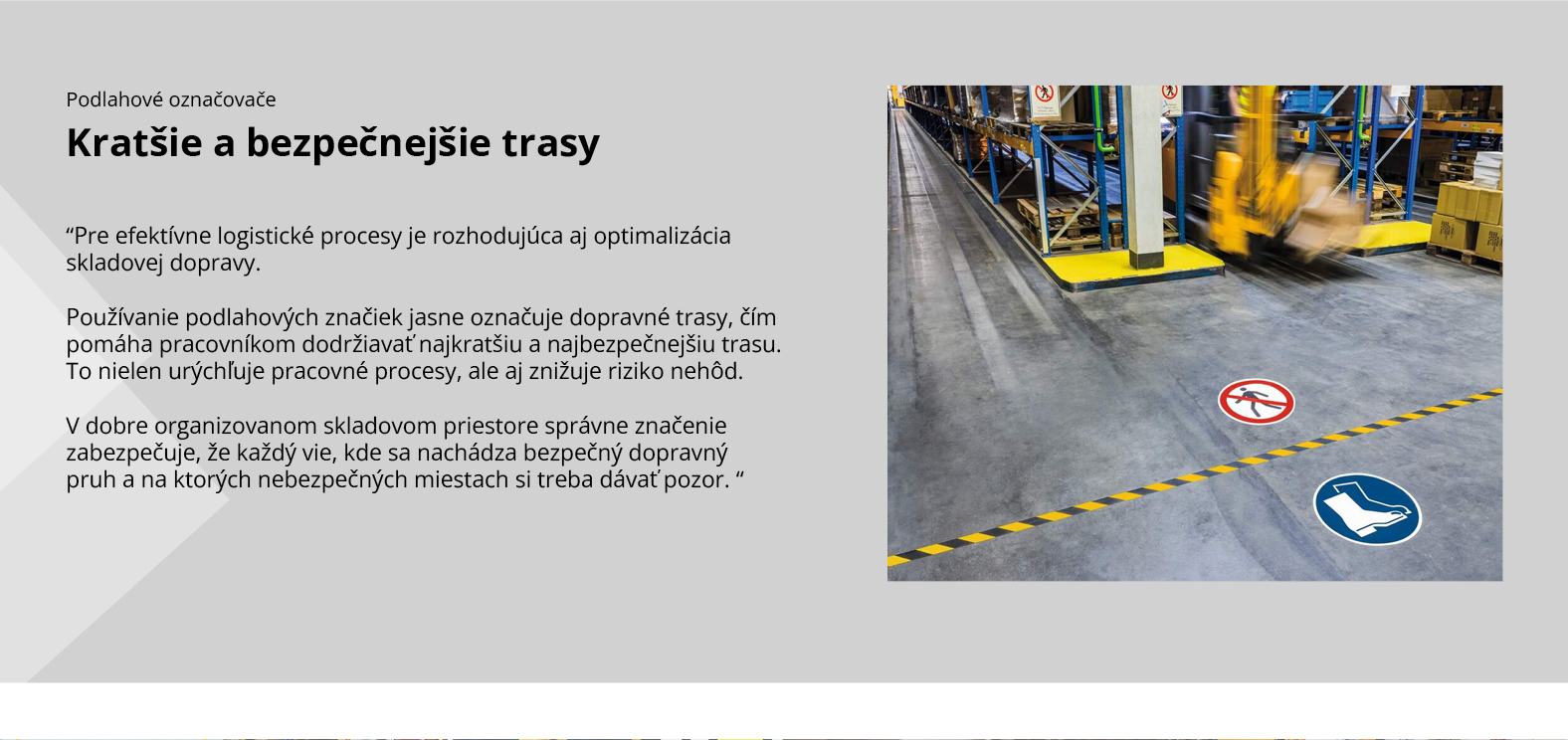 | Vizuálna komunikácia predstavuje 80 % všetkých ľudských interakcií. To je obzvlášť dôležité v oblastiach, ako je logistika, kde sa vyžaduje rýchla a presná výmena informácií. Jasné označenie skladovacích miest, chodieb, nebezpečných zón a iných oblastí nielen skracuje čas hľadania, ale aj výrazne zvyšuje bezpečnosť práce. Vizualizácia je v tomto prípade nástrojom, ktorý podporuje efektívnejšiu prácu, zvyšuje produktivitu a znižuje možnosť vzniku chýb |