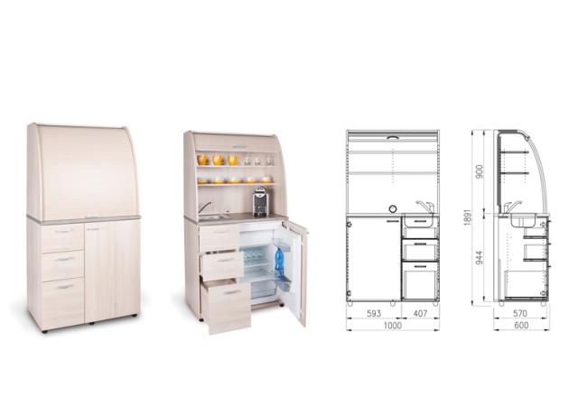 • Dve police vo vrchnej časti kuchynky poskytujú dostatočnú kapacitu na poháre, šálky a taniere. Na pracovnú dosku môžete umiestniť napr. kávovar a káblovou priechodkou v zadnej časti vyvediete kábel z priestoru kuchynky.