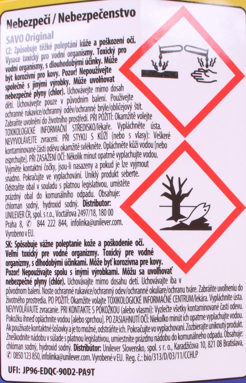 PO POŽITÍ: Okamžite volajte TOXIKOLOGICKÉ INFORMAČNÉ CENTRUM/ lekára. Vypláchnite ústa, NEVYVOLÁVATE zvracanie. Pri kontakte s pokožkou (ALEBO VLASMI): Vyzlečte všetky kontaminované často odevu. Pokožku ihneď opláchnite vodou (alebo sprchou). PO ZASIAHNUTÍ OČÍ: Niekoľko minút ich opatrne vyplachujte vodou. Ak používate kontaktné šošovky a je to možné, odstráňte ich. Pokračujite vo vyplachovaní. Zozbierajte uniknutý produkt.Zneškodnite nádobu v súlade s platnou legislatívou, umiestnite prázdnu nádobu do komunálneho odpadu. Obsahuje chlóran sodný, hydroxid sodný.
