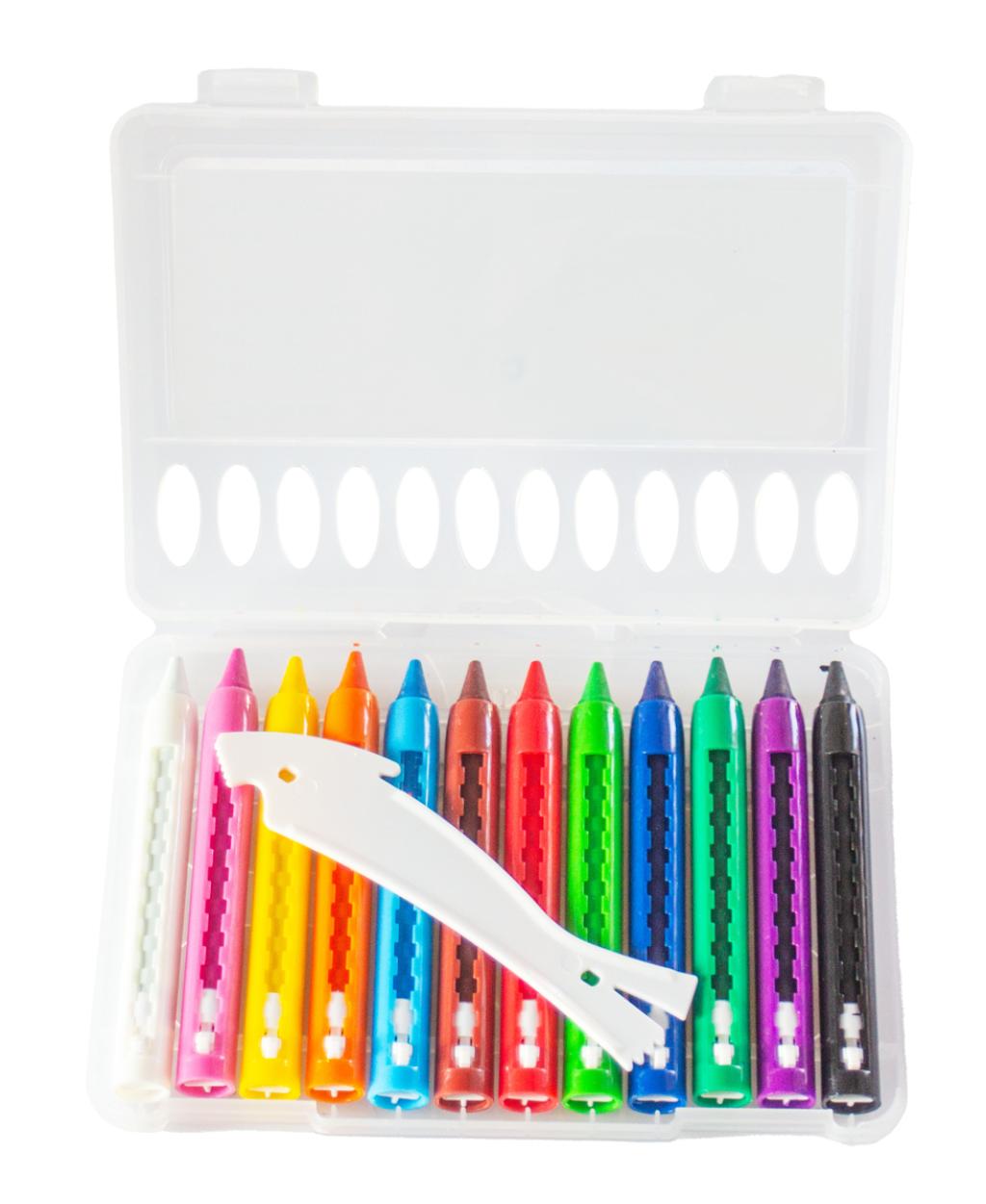12 vodeodolných farebných voskových pasteliek, ktoré sú ideálne na kreatívne tvorenie. Pastelky sa dodávajú v praktickom posuvnom tubuse pre jednoduché skladovanie a vyberanie. Súčasťou balenia je aj škrabka na pastelky pre ešte viac kreatívnych možností.